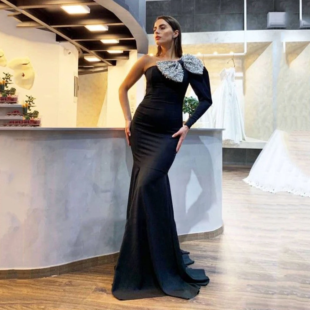 Elegant Black Women Formal Dresses Evening With Big Bow One Shoulder Long Sleeve Prom Gowns Special Banquet Wear Custom Made Evening Dresses Aliexpress